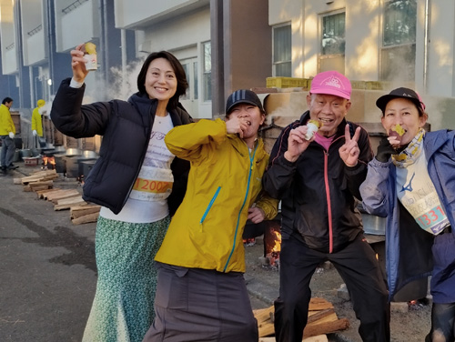 スタート前にサツマイモ(焼き芋)を食べる筆者(右から2人目) 後方には蒸かし釜が10基ほど湯気を上げていた