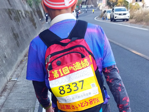 そして、コースの関門の29㎞6時間、35㎞7時間以内の通過を気にしながら、1㎞を11~12分のペースで走りました。速歩より遅いので、越されるばかりでした。